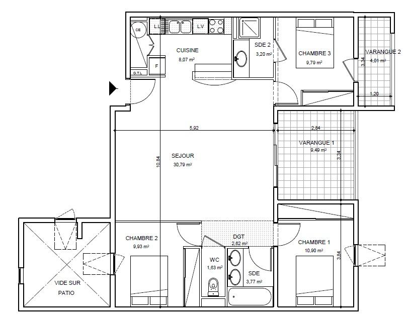 Sur la droite, de part et d’autre d’une salle de bain et d’un WC séparé, se trouvent 2 chambres climatisées respectivement de 11m² et 10 m².