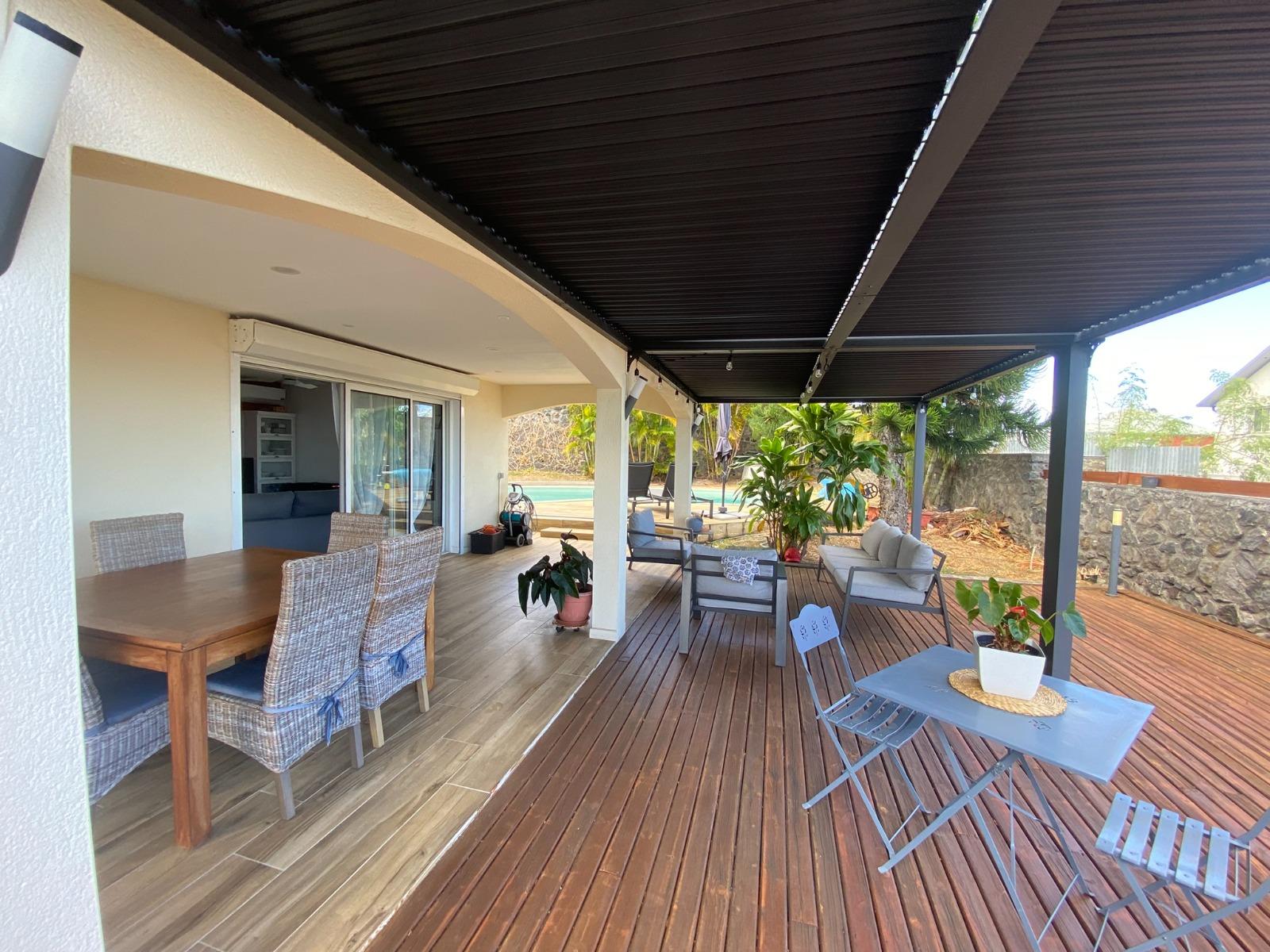 La pièce de vie exposée Nord s’ouvre sur une varangue de 40m2 prolongée par une terrasse partiellement couverte par une pergola bioclimatique. Dans le jardin aménagé d’arbres fruitiers, se trouve un espace piscine avec chauffage solaire entourée de sa plage en bois.